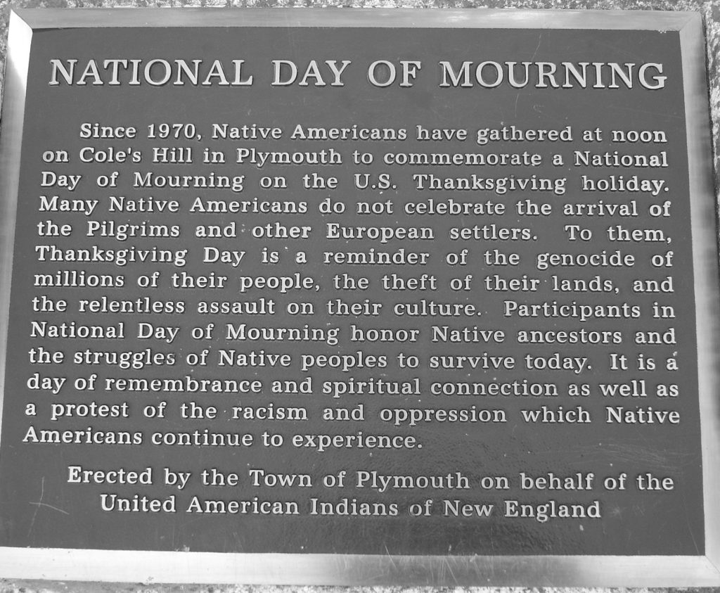National Day of Mourning plaque on Cole’s Hill, in Plymouth. Photo by Melissa Doroquez (CC-BY-SA 2.0 via Wikimedia Commons)