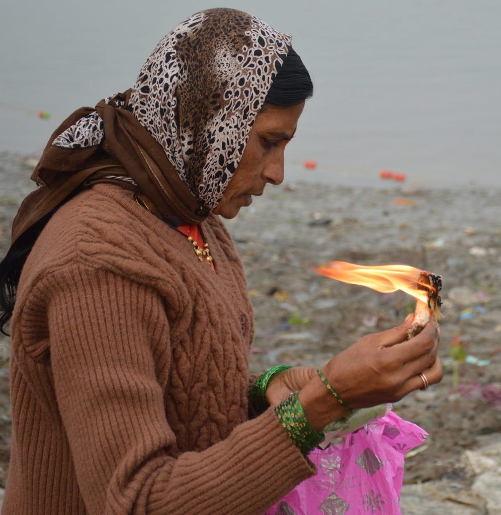 Devotee during the Makar Sankranti festival in Kolkata, 2018. Photo by Biswarup Ganguly, CC BY 3.0, via Wikimedia Commons